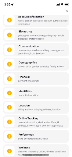 Most 23andMe customers can imagine what their genomic data looks like (a lot of A’s, C’s, G’s, and T’s). However the company collects a host of data in addition – including your home address, family history, payment details, and private messages and comments you’ve exchanged with the company. In the Permission Slip app, we show a complete list of the data 23andMe collects according to their privacy policy: