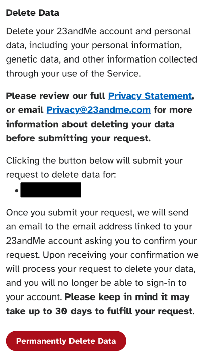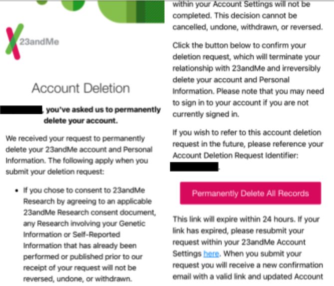 Open your email to find the confirmation from 23andMe; you may need to check your spam folders to find it. Press the “Permanently Delete All Records” button in the email; try to do it right away since the link expires after 24 hours. Once you confirm, 23andMe will begin the process of deleting your data. Under California state law they have up to 45 days to execute the data deletion so the process may take a while.