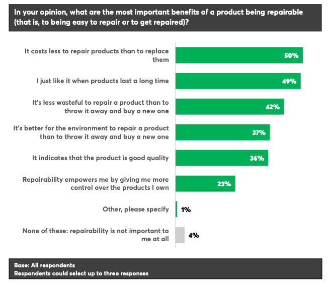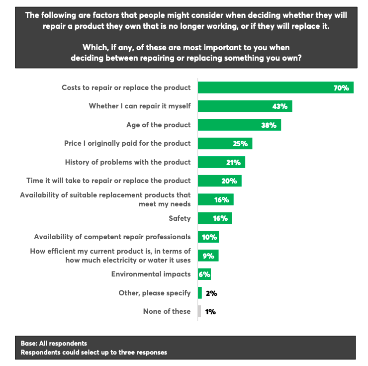 Broadly, the survey found that when consumers were deciding on whether or not they should repair a product, seven in 10 consumers focused on the cost of the repair, while roughly four in ten (43%) looked at whether they can repair the product themselves. It’s clear that keeping repair costs reasonable is essential for ensuring that consumers try to repair products rather than replace them.
