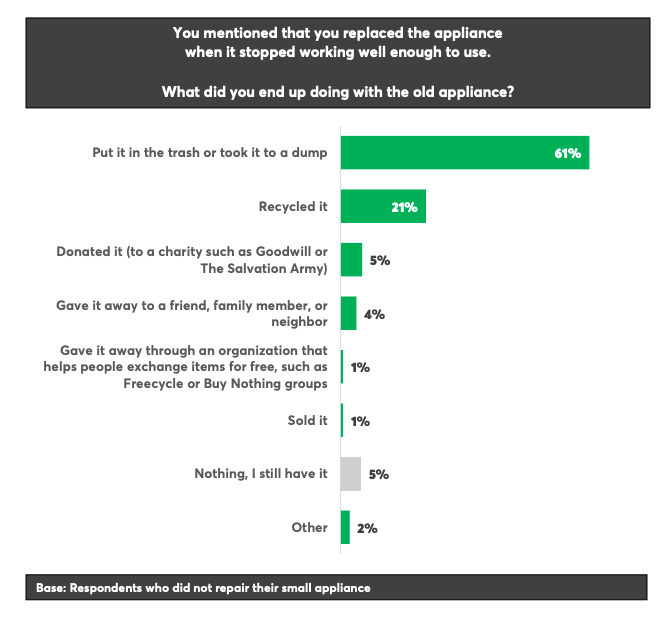 Unfortunately, of those who elected to replace their small appliance, a majority threw it away or still have it lying around, which means the lack of repair for these small appliances leads to real ecological harm.