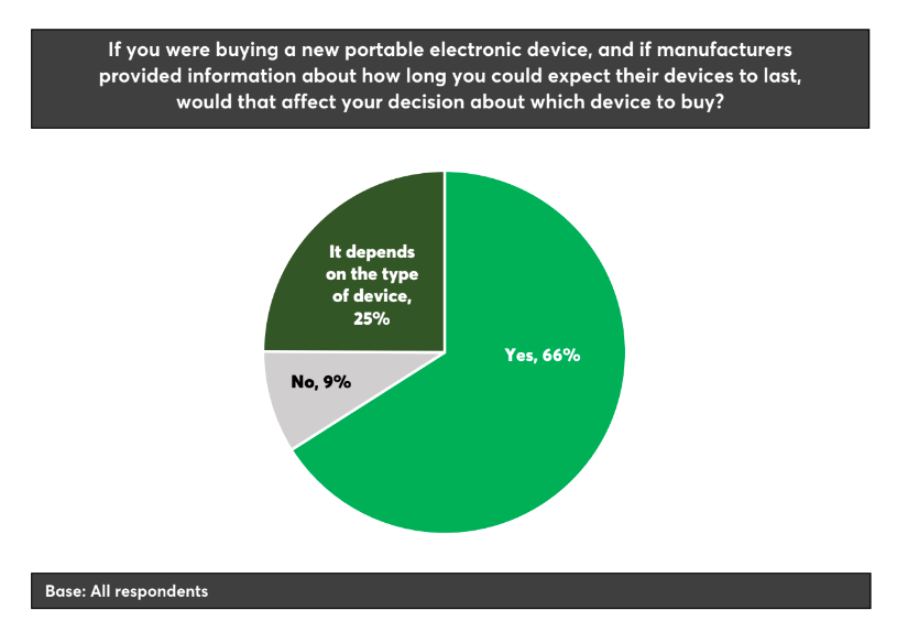Finally, we asked people to imagine a scenario where manufacturers of portable electronic devices provided information about how long you could expect their devices to last. Then we asked people if that would affect their purchase decision if they were buying a new device. Unsurprisingly, two out of three (66%) Americans said that it would affect their decision about which device to buy.