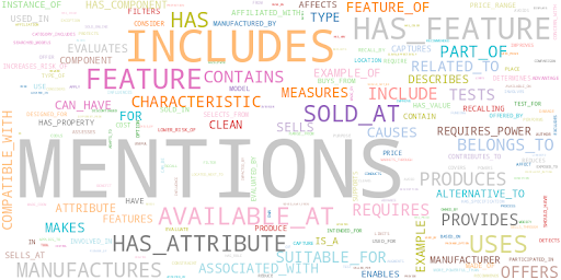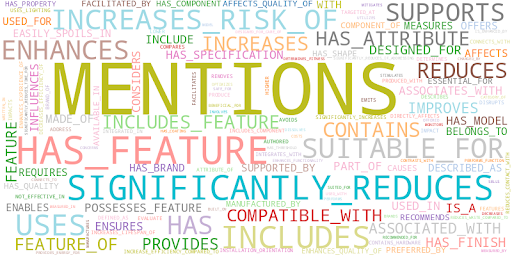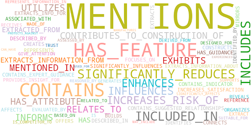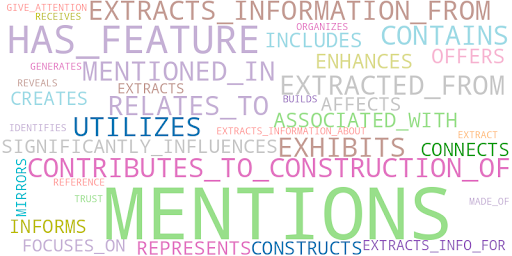 A wordcloud of the relationship labels with their sizes being defined by the frequency of their repetition in the KG.