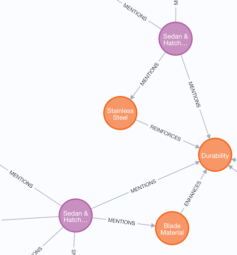 After a few more enhancements in our instructions to the LLM for the curation, we arrive at these nodes and relationships. We made significant improvements by shifting many of the general instructions that applied to all documents from the “system prompt” to the “user prompt,” streamlining the overall design. Additionally, the issue of overly broad nodes such as Ai_generated_guidance has been largely resolved. Nodes are now being organized under clearer and more meaningful categories like Product, Brand, and Technology, resulting in a more structured and intuitive knowledge graph.