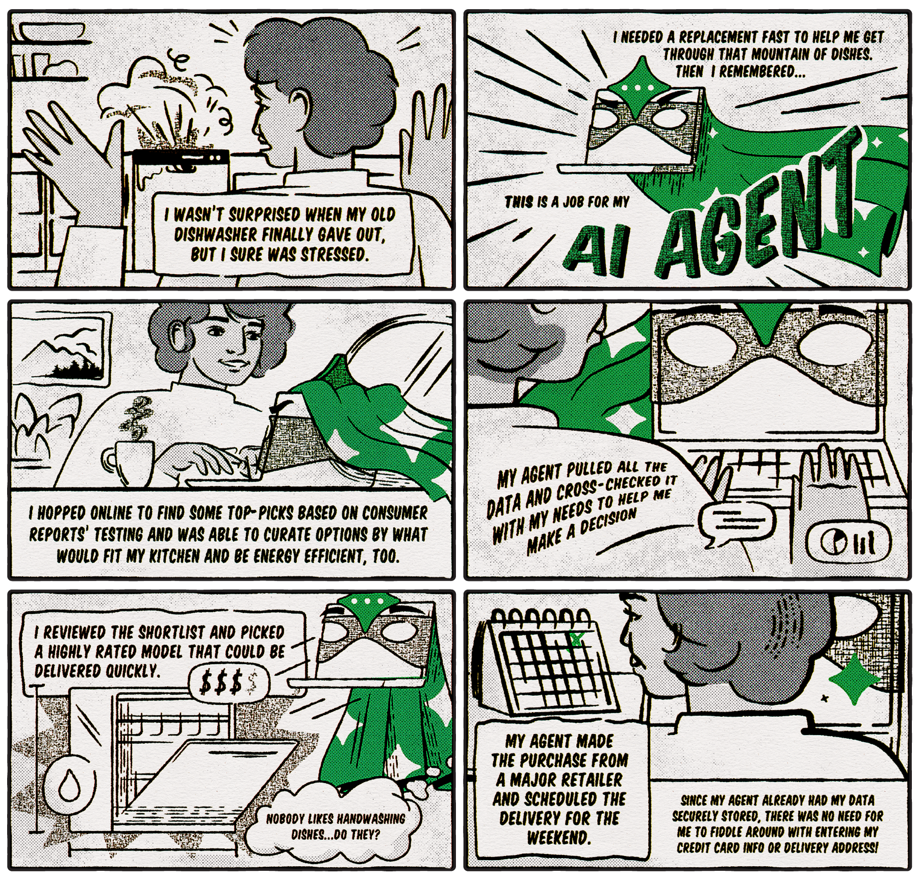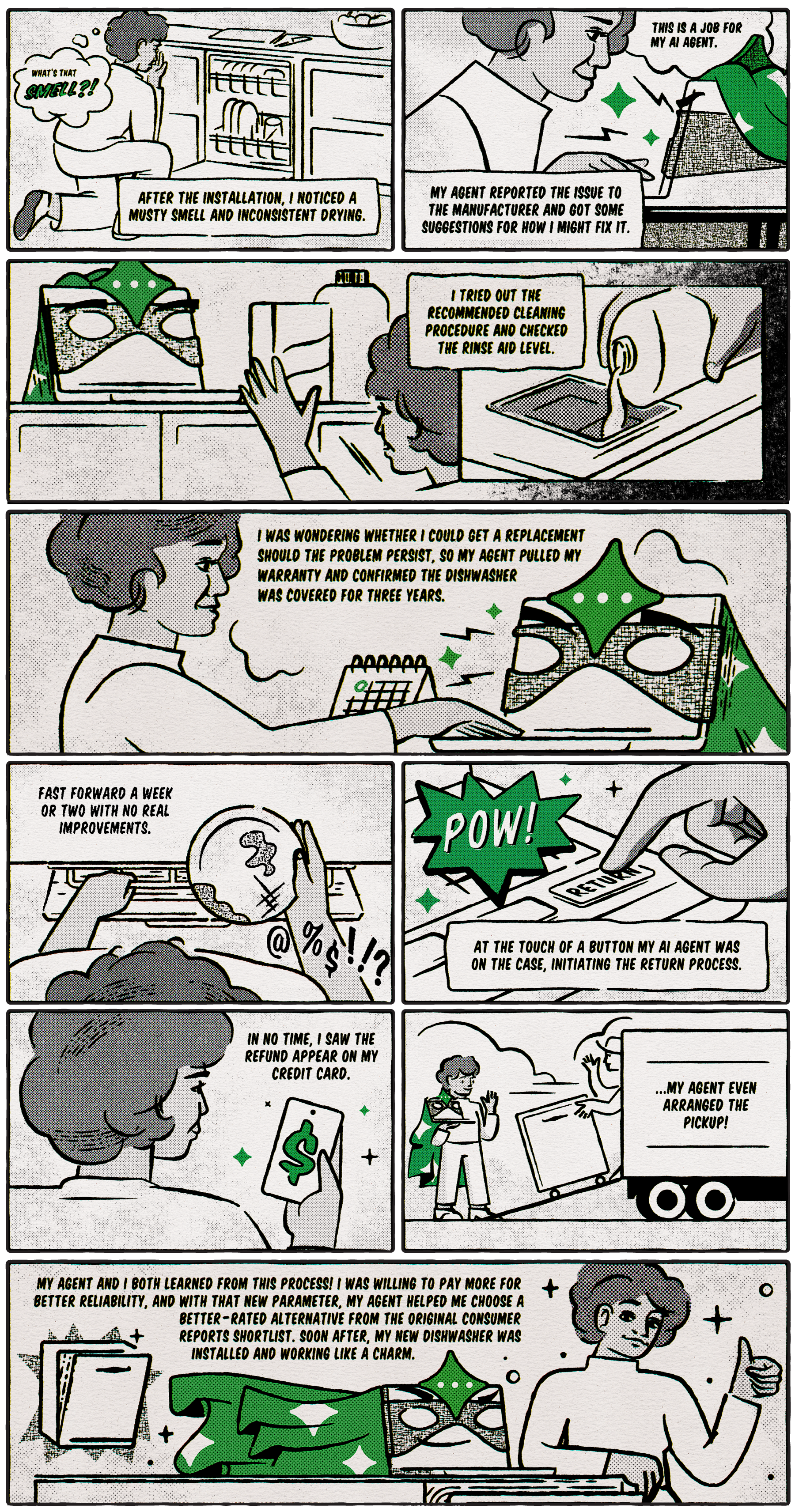 In this post, through the comic series below, we illustrate that journey with a superhero-like AI defender, safeguarding consumer interests, navigating complex choices, managing purchases and support inquiries, and effortlessly negotiating returns.