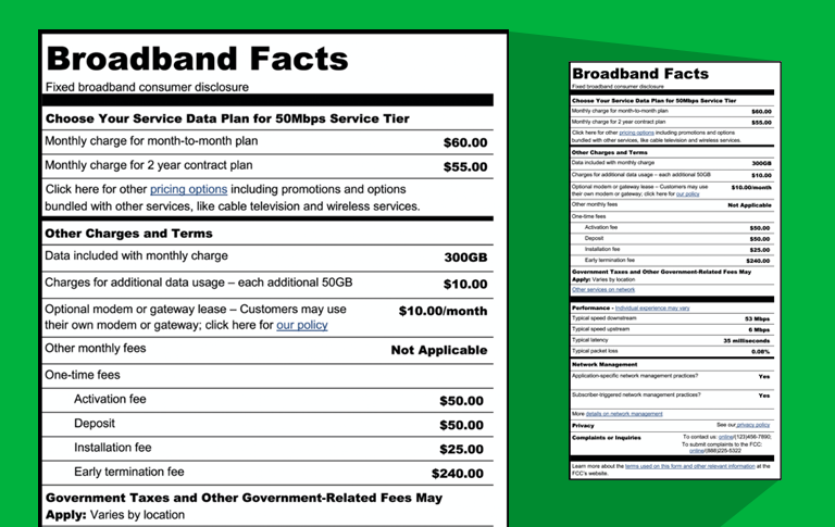 In 2010, the Federal Communications Commission (FCC) issued its first Open Internet Order, which included the first Transparency Rule for broadband providers in addition to its better-known net neutrality provisions. The rule enumerated the information that had to be disclosed to consumers at the point of sale, including three broad categories—network practices, performance characteristics, and commercial terms—as well as specifics such as the monthly price, actual and expected internet speed, and fees for early termination. It did not, however, mandate any specific format for delivering that information.