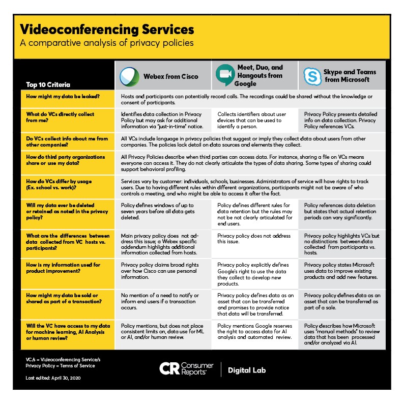 We invite you to review our comparative analysis of the privacy policies for Skype, Meet, and Webex. Based on this examination of the privacy policies and additional research into some related features, we have also recommended areas where all videoconferencing services can better support and protect consumers. Some are fairly simple clarifications; others would require additional work and thought. The areas of improvement are changes that would immediately benefit consumers.